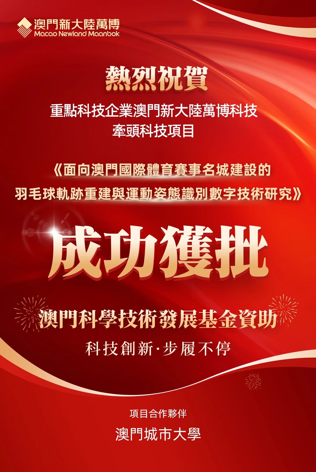 近日,由澳门特区政府重点科技企业 —— 澳门米兰·(milan)万博科技牵头,联合澳门城市大学共同研发的《面向澳门国际体育赛事名城建设的羽毛球轨迹重建与运动姿态识别数字技术研究》成功获批澳门科学技术发展基金资助。